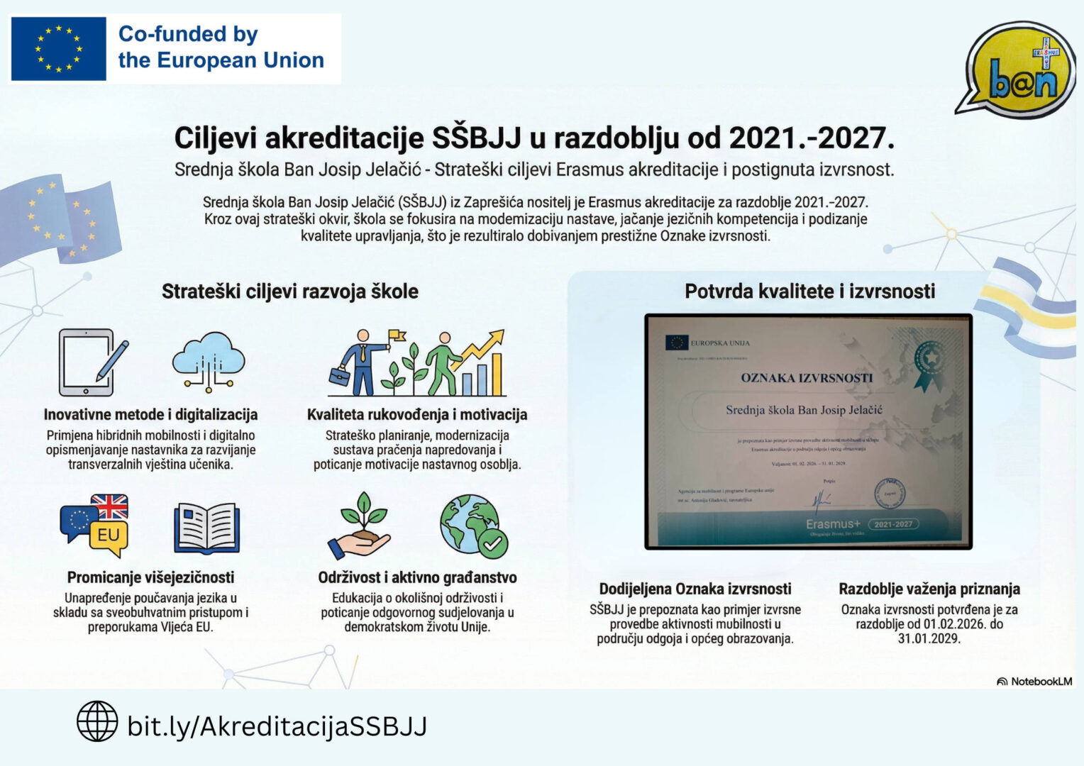 S velikim ponosom i zadovoljstvom objavljujemo kako je trud naših učenika i djelatnika dobio najviše europsko priznanje. Naša škola, Srednja škola Ban Josip Jelačić, službeno je nagrađena Oznakom izvrsnosti (Excellence Label) za provođenje Erasmus aktivnosti mobilnosti!
